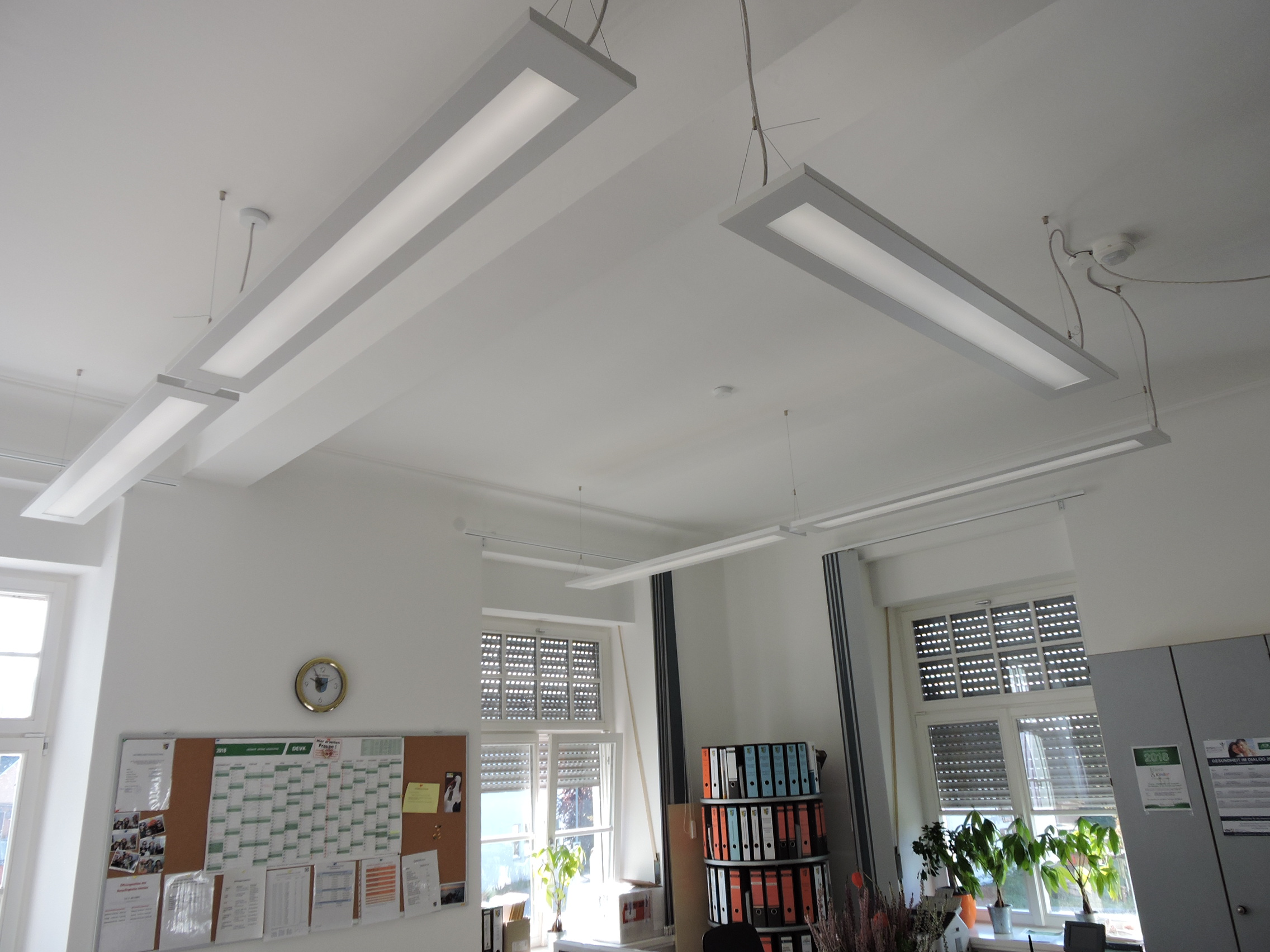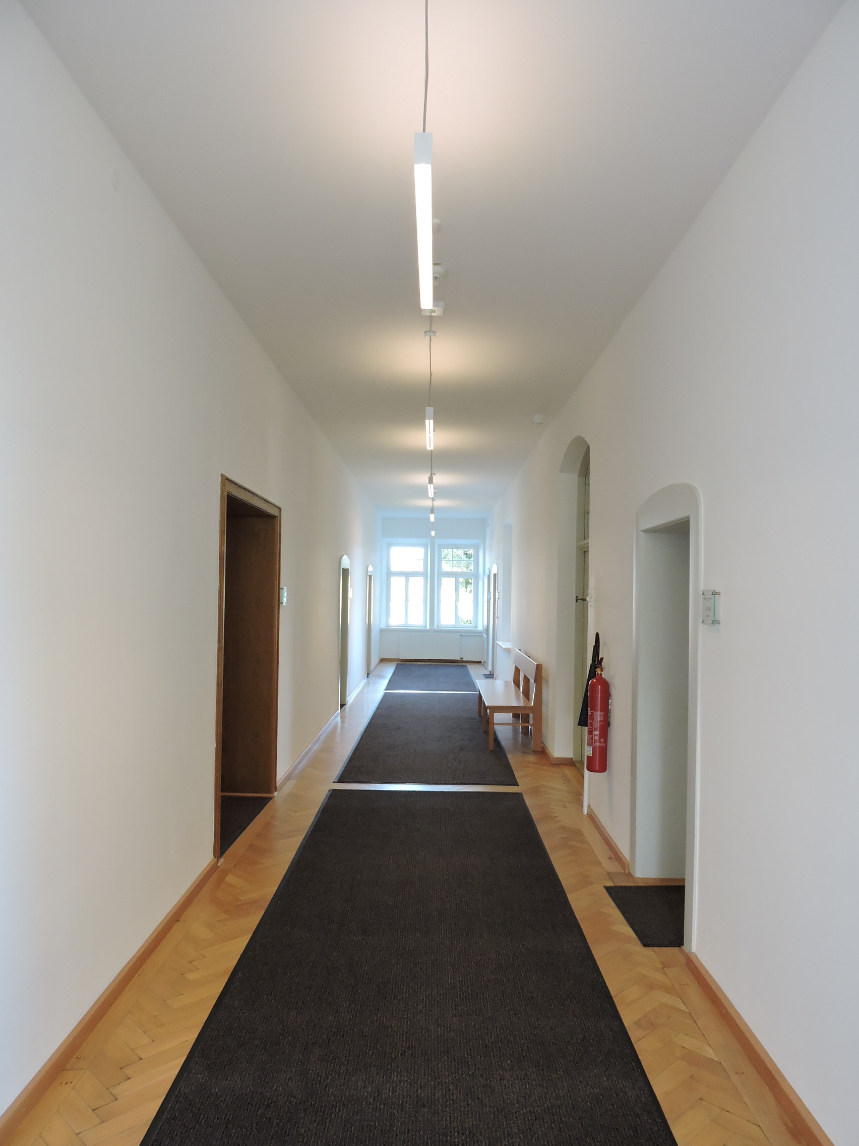 Im Zeitraum von August 2017 bis März 2018 erfolgte die Bauausführung. Bei laufendem Betrieb des Rathauses wurde im Zuge der Sanierungsmaßnahmen die alte Beleuchtungsanlage demontiert und eine neue LEDBeleuchtungsanlage mit tageslichtabhängiger Steuerung und Präsenzerkennung (modernes Lichtmanagement) installiert. Insgesamt wurden 88 neue LED-Leuchten mit einer Leistungsstärke zwischen 9 W und 48 W installiert. Die Beleuchtungsstärken wurden entsprechend der Nutzung zwischen 100lx bis 300lx gewählt.